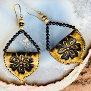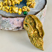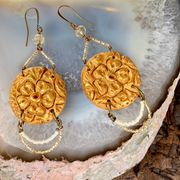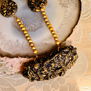 As I strolled through the Versailles Palace in France, I was mesmerized by its gold and ornate furnishings. I sat in the gardens of the palace later that afternoon and sketched The Golden Aura necklace and earrings, complete with hand strung beads, gold clay and pigments, and a golden aura fit for a queen.