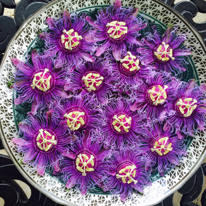 Purple combines the calm stability of blue and the fierce energy of red. Purple flowers make me swoon a little bit more than others. I have these purple Passion flowers in my garden. The vine grows profusely in the summer and is covered with numerous blooms that loyally open with the sun’s first rays every morning. To me, the flower symbolizes strength and power, beauty and grace. It is a reminder that we can carry each of one these qualities within us with elegance and poise just as the majestic Passion flower does.