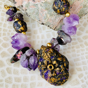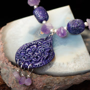 Amethyst stones are believed to emit a calming and serene energy that works their way into the mind in order to promote mindfulness and focus. The inner and outer beauty of the Passion flower and the tranquility of the Amethyst is captured in the Purple Passion necklace.