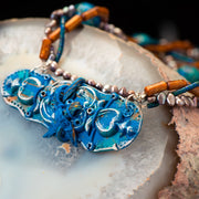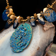 This grand necklace was inspired by the glitz and glamour of the drive from Monaco to St. Tropez as well as the serene tranquility of the French Reviera. The morning after a particularly over-the-top party, I rememeber meditating on my hotel balcony, listening to waves crashing on pebble stones, and thinking to myself that this was a splendid way to wake up to the world. The Picasso Museum in Antibes was a significant highlight of my stay here.